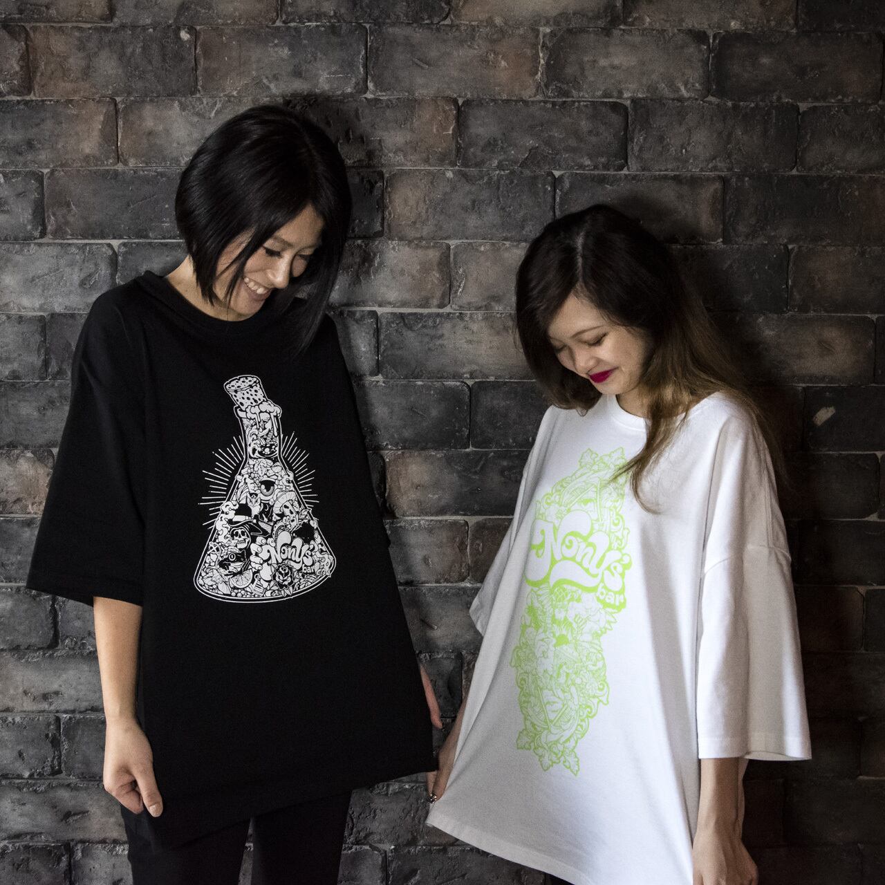 ポップ、コミカル、ミステリアスの融合。当店の玄関一面に描かれている、Nony's Barのメインテーマ「驚きと感動」をモチーフにしたイラストTシャツ(ビッグシルエット)です。