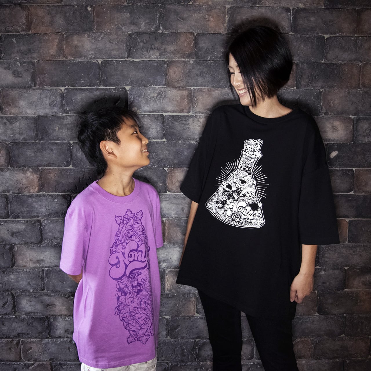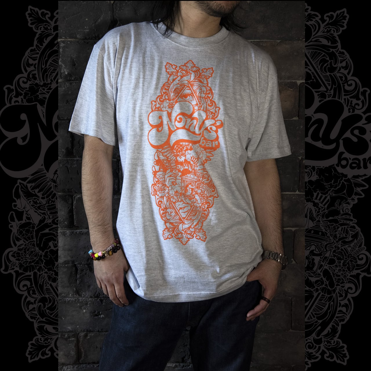 ポップ、コミカル、ミステリアスの融合。当店の玄関一面に描かれている、Nony's Barのメインテーマ「驚きと感動」をモチーフにしたイラストTシャツ。